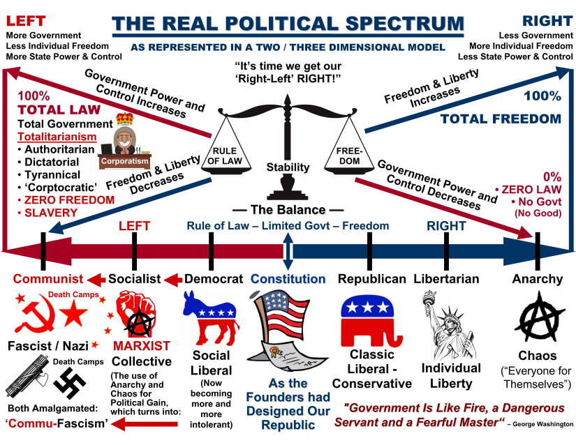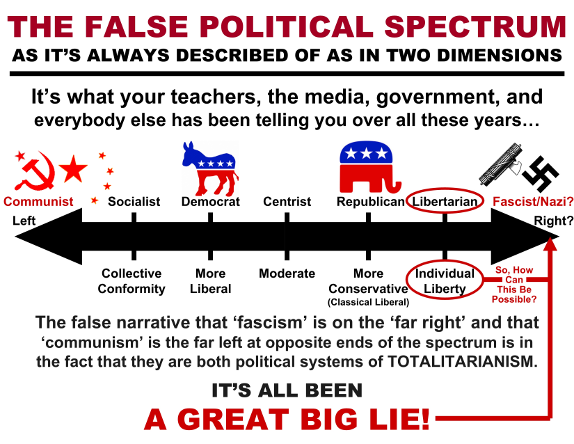 Actually, the spectrum is always presented in the simplified form as a representation in two dimensions ('bi-polar'). To get a more accurate reading of the true political spectrum, it actually needs looked at as in four dimensions ('quadra-polar').