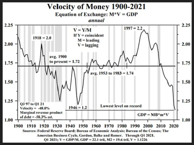 The velocity of money is the relationship betweeen economic growth and money creation / money supply has now broken down and is now at a lower level