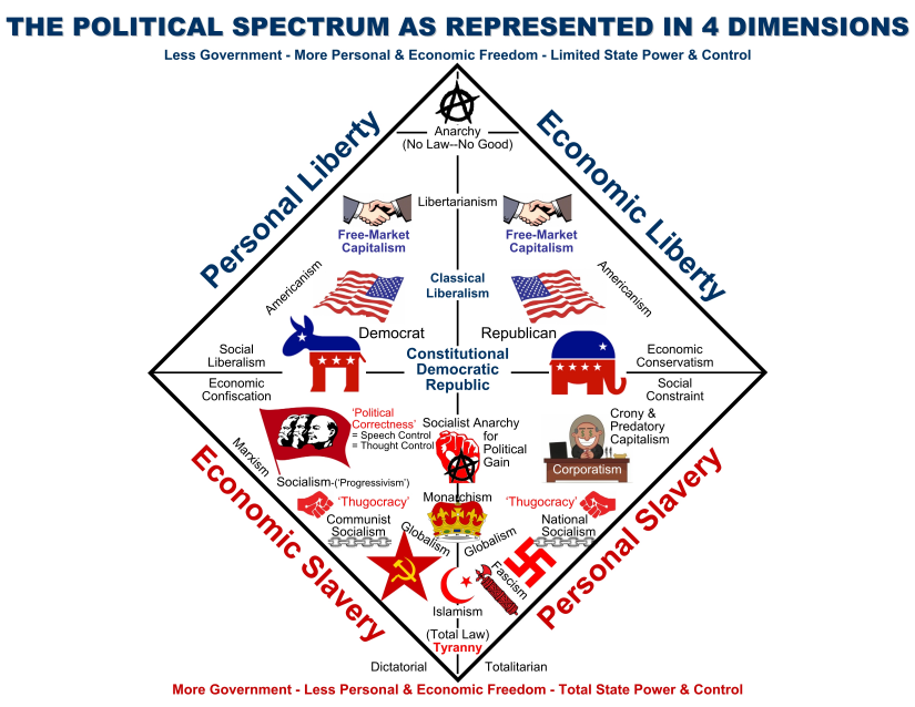 Actually, the spectrum is always presented in the simplified form as a representation in two dimensions ('bi-polar'). To get a more accurate reading of the true political spectrum, it actually needs looked at as in four dimensions ('quadra-polar').