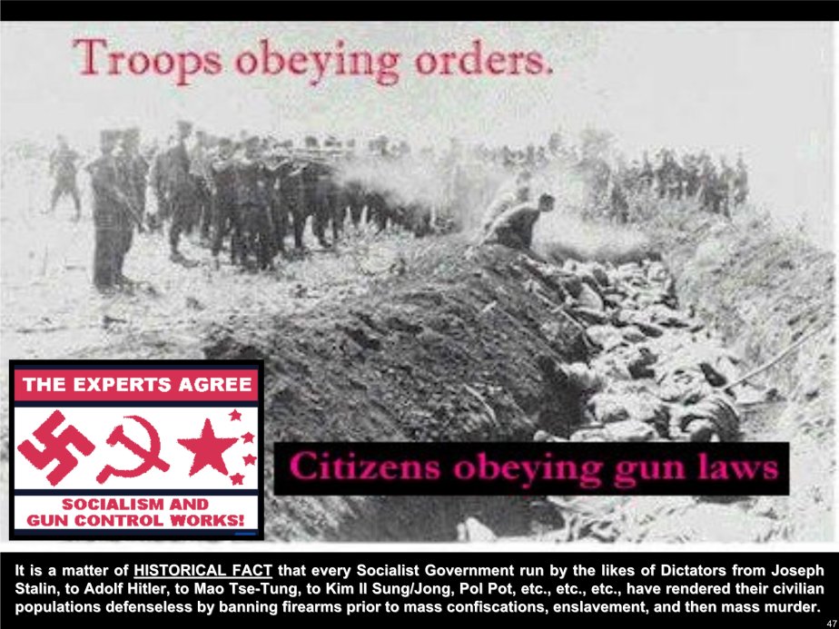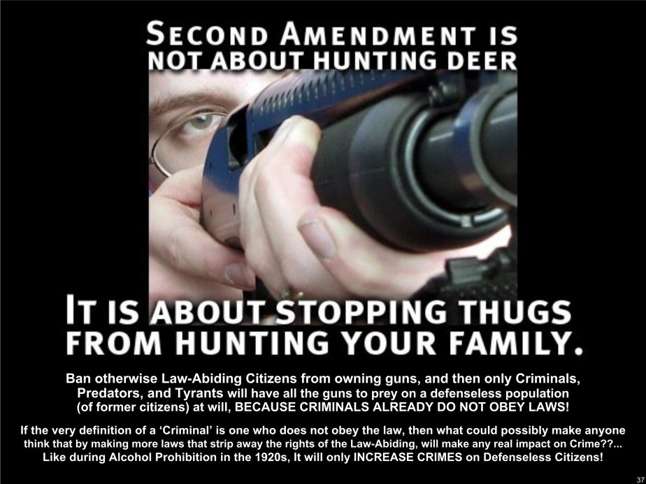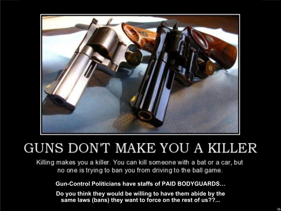 Why should ordinary law-abiding citizens own a gun?... Because owning a police officer is too expensive. Time and time again, statistics show that the that law enforcement arrives usually just in time, to draw the chalk outline around your body or to call for an ambulance.